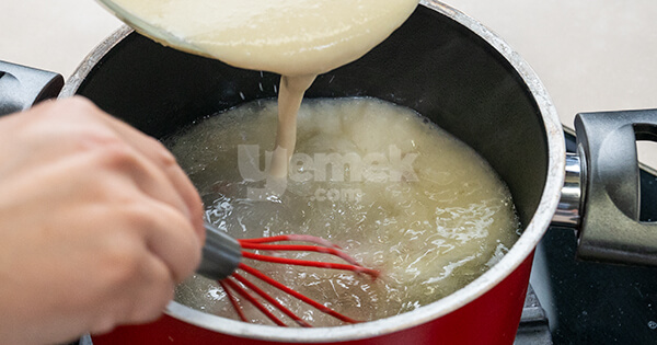 5Ardından tencereye yavaş yavaş tüm karışımı ekleyip hızlıca karıştırın.