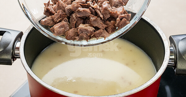 2Haşlanmış kuzu gerdan etinin kemiklerini ayıklayın. Haşlanmış etlerini bir çatal yardımıyla didikleyin.