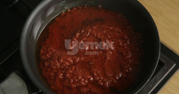 9Bir tavanın içine 1,5 çay bardağı zeytinyağı ve 1 yemek kaşığı biber salçasını alın. Üzerine rendelenmiş ve rondodan geçirilmiş 1 su bardağı domatesi ekleyin.