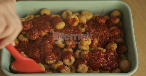 11Ardından hazırladığınız sosu üzerine gezdirin ve güzelce karıştırın.