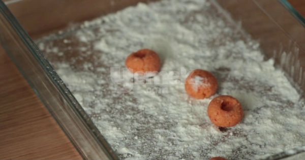 5Elinizi hafifçe ıslatın. Hamurdan fındıktan biraz büyük parçalar kopararak iki avucunuzun içinde yuvarlayın. Yuvarladıktan sonra orta kısmına parmağınızla bastırarak bir çukur açın.
