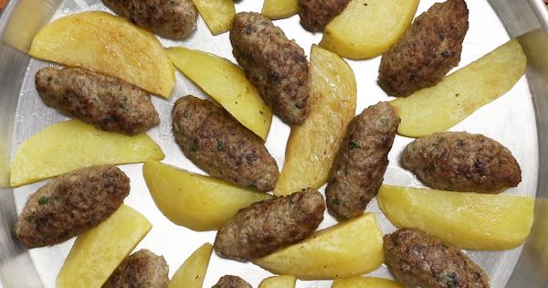 Fırında pişirilmiş, patates ve biberlerle hazırlanan klasik Türk köfte yemeği
