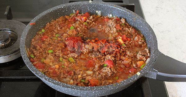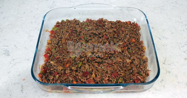 6Hazırladığınız kıymalı harcı üzerine döküp eşit bir şekilde yayın.