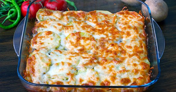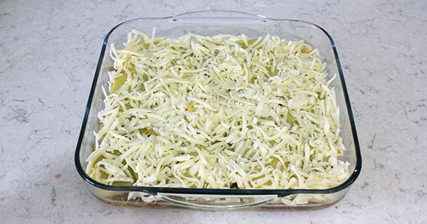 7Kalan patatesleri kıymalı harcın üzerine dizdikten sonra 250 gram rendelenmiş kaşar peynirini de üzerine serpip güzelce dağıtın.