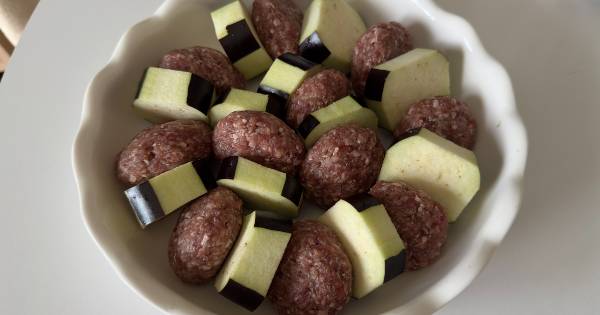 4Yuvarlak fırın kabına, bir köfte bir patlıcan olacak şekilde yan yana dizin. Üzerine zeytinyağı gezdirin.