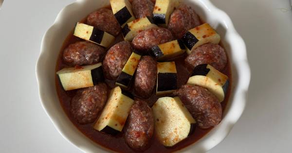 5Sosu için bir kapta salça ve suyu karıştırın. Köfte ve patlıcanların üzerine gezdirin.