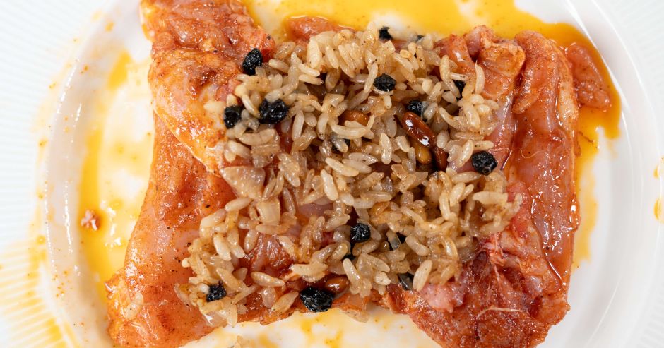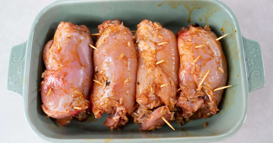 6Tavuk butlarından birisini alın derisi altta kalacak şekilde yayın, üstüne hazırladığınız iç pilavdan koyun. Sarma gibi sardıktan sonra açılmaması için kenarlarından kürdan yardımı ile birleştirerek kapatın.