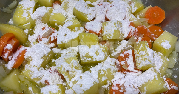 4Üzerine 1 tatlı kaşığı unu ilave edip karıştırın.