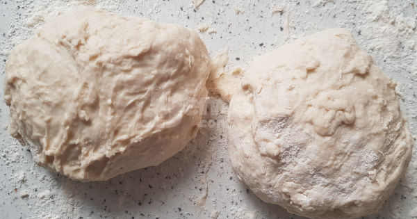 5Hamur az yapışkanlaştığında üzerine un serpin, ikiye bölüp iki top oluşturun. Topları üst üste koyun, basın, tekrar ikiye bölün ve yeniden top yapın. Bu işlemi 3 kez tekrarlayın. Son iki topu örtüp sıcak bir yerde 2 saat mayalanmaya bırakın.