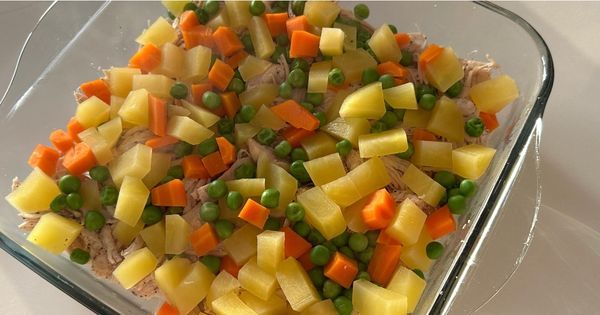 5Tavukların üzerine sırasıyla 1 adet haşlanmış ve doğranmış patatesi, 1 adet haşlanmış ve doğranmış havucu ve 1 su bardağı haşlanmış bezelyeyi ekleyin.